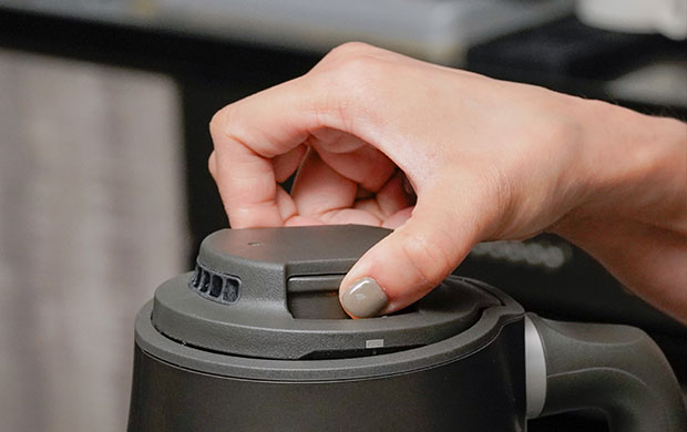 這支壺的設計讓新手更安心:「一鍵掀蓋+蒸氣導向設計,能避免操作時因蒸氣回噴而燙手的情況。」