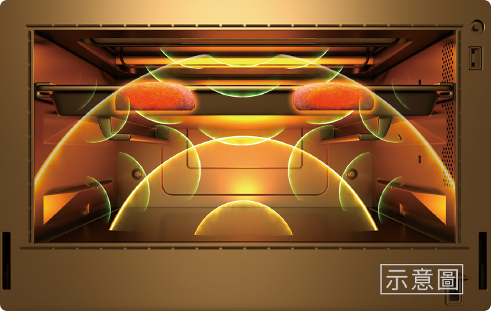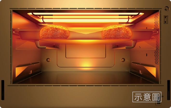 透過微波功能將食材由外而內徹底加熱後,自動切換爲燒烤功能