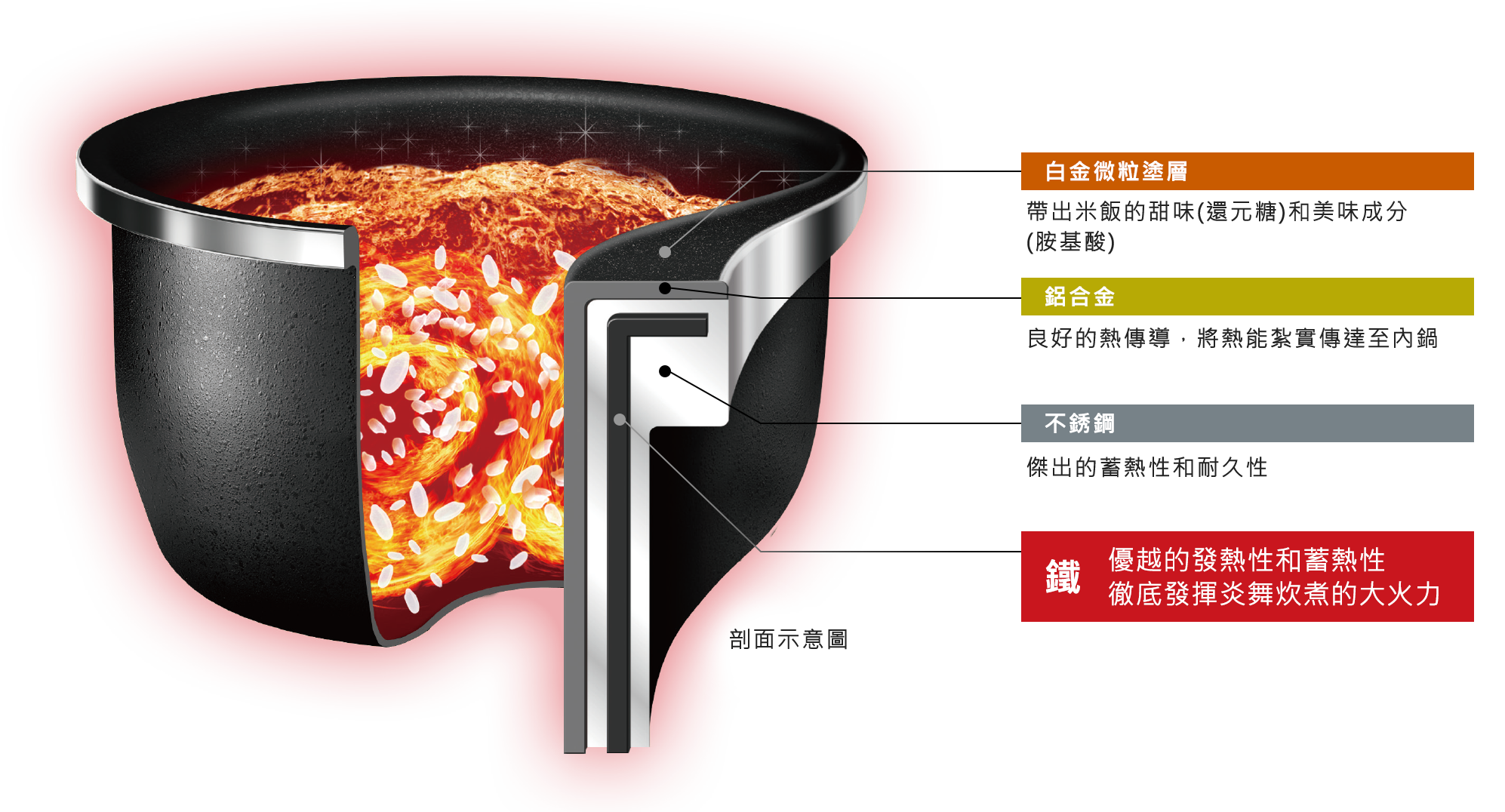 選用適合IH加熱器的「鐵」,並搭配「鋁合金」和「不銹鋼」,實現高蓄熱・高發熱・良好熱傳導的組合。「白金微粒塗層」加工,白金觸媒作用改變水質,激發出米飯甜味及美味,締造白金口感。