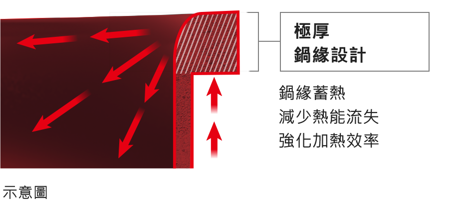 鍋緣加厚,減少溫度流失 提升內鍋整體熱傳導效率