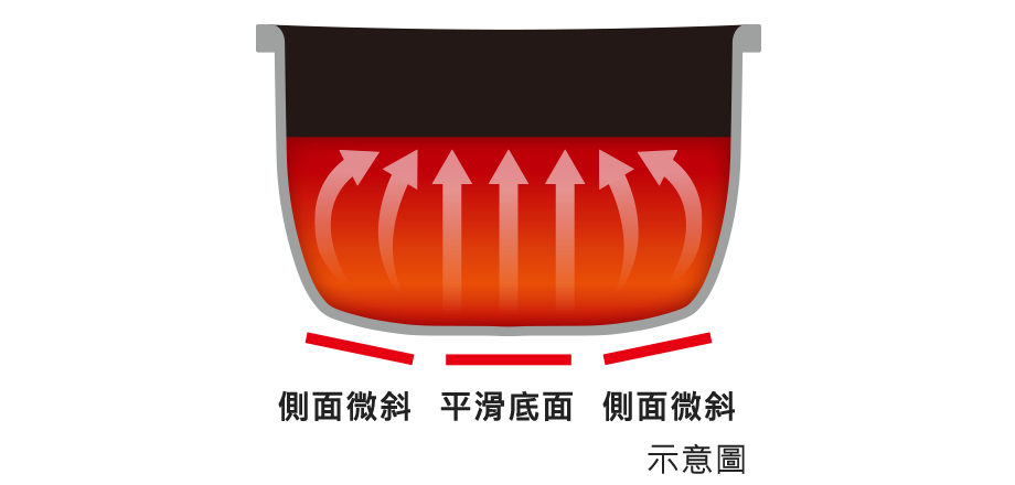 側面微斜,促成從側面朝中心對流;平滑底面,自鍋底的向上對流,產生激烈的翻騰